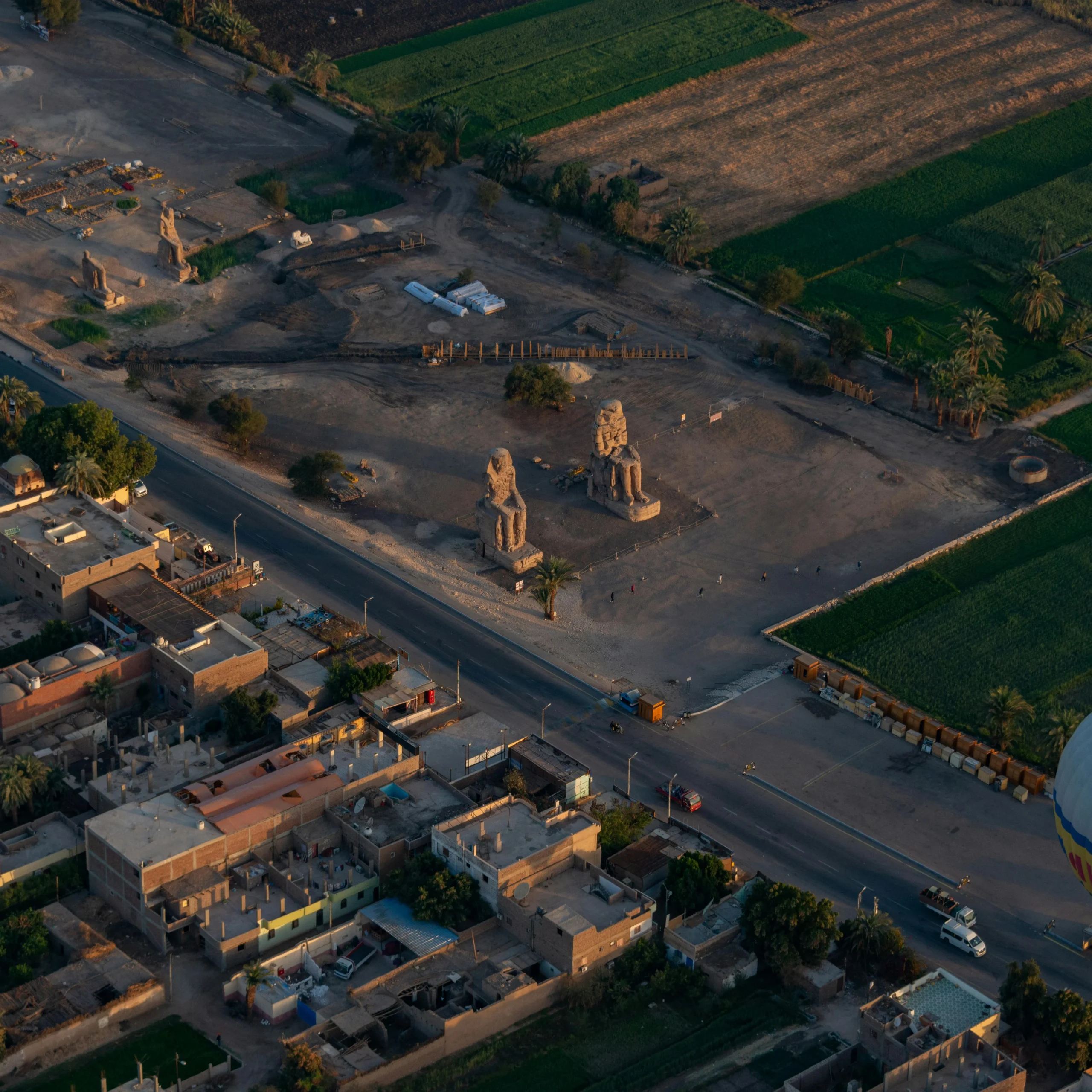 Two massive stone statues depicting Pharaoh Amenhotep III, serving as the gateway to his (now largely lost) mortuary temple